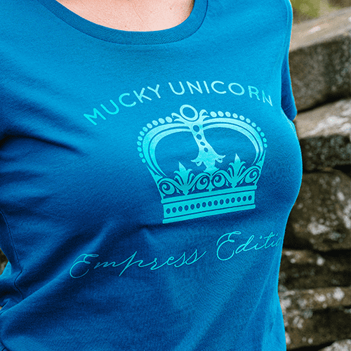 Our blue t-shirt boasts our Mucky Unicorn empress logo to the front in a white print.